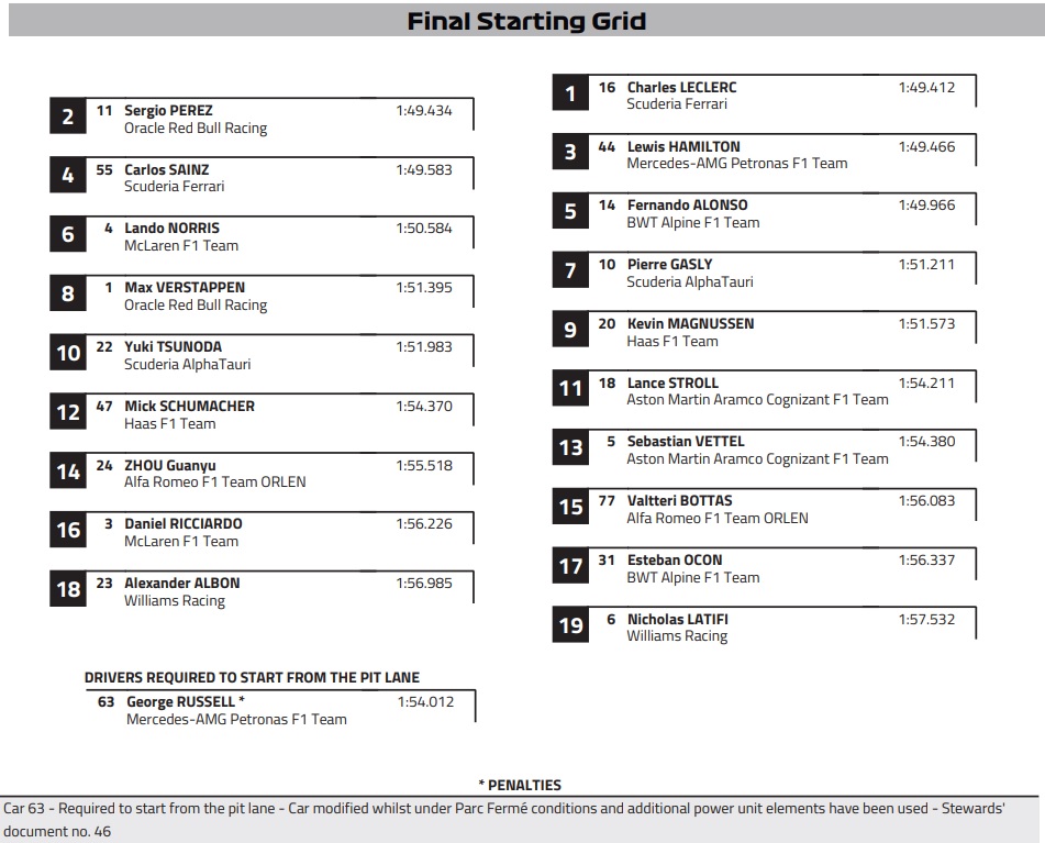 A grelha de partida ficou assim ordenada, após a recente penalização a George Russell, que vai arrancar do pitlane.