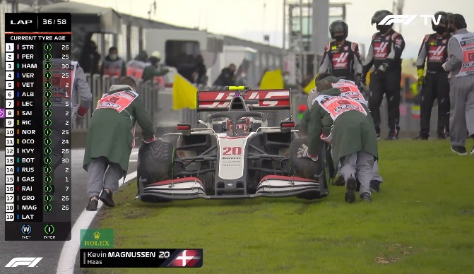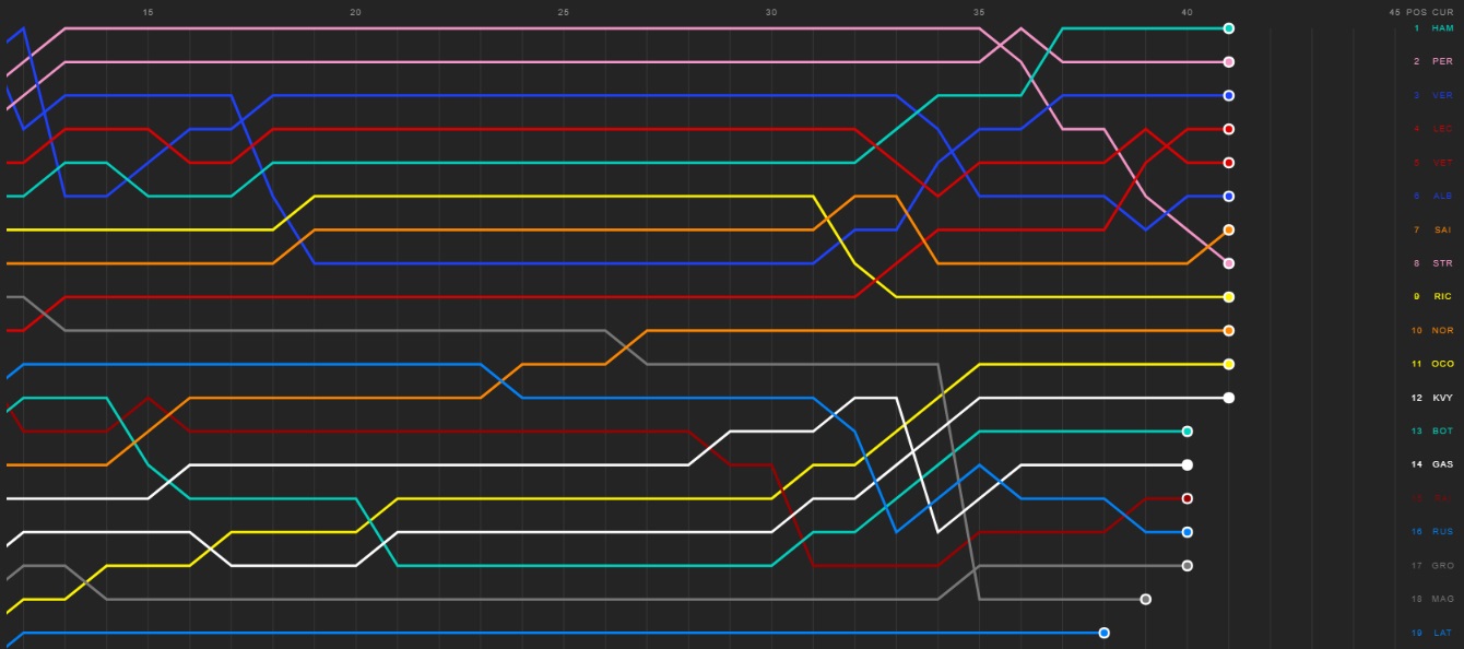 Albon já está na frente de Stroll, que agora está a perder muito tempo, já tendo sido ultrapassado por Carlos Sainz. O piloto da Racing Point é agora oitavo. Kevin Magnussen teve problemas, no final das boxes, com o piloto da Haas a estar nas últimas posições. Nicholas Latifi acabou por se retirar.