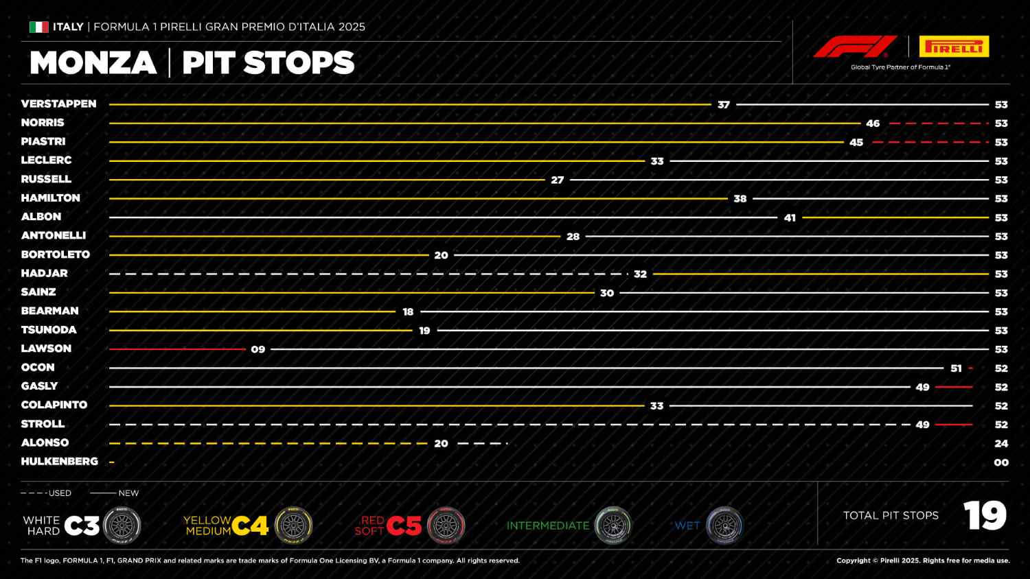 Conforme o esperado, a maioria dos pilotos optou por iniciar o primeiro stint com pneus médios, enquanto cinco – Stroll, Gasly, Ocon, Hadjar e Albon – escolheram os duros. Lawson foi o único a arrancar com pneus macios. Os compostos C5 fizeram uma nova aparição nas fases finais, quando cinco pilotos – Norris, Piastri, Stroll, Gasly e Ocon – os montaram para as últimas voltas, após terem estendido o stint inicial muito além do previsto. O stint mais longo foi protagonizado por Ocon, que completou 51 voltas com pneus duros, enquanto Norris percorreu 46 voltas com os médios. Lawson registou o maior número de voltas com os macios, com nove passagens.