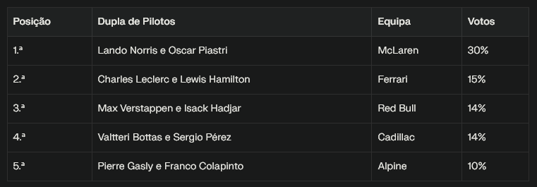 A segunda posição pertenceu à dupla da Ferrari, Charles Leclerc e Lewis Hamilton, com 15% dos votos — vencedores da edição anterior da sondagem. O terceiro lugar coube a Max Verstappen e Isack Hadjar, da Red Bull, com 14%, superando por escassos 40 votos a formação da Cadillac com Valtteri Bottas e Sergio Pérez, também com 14%.