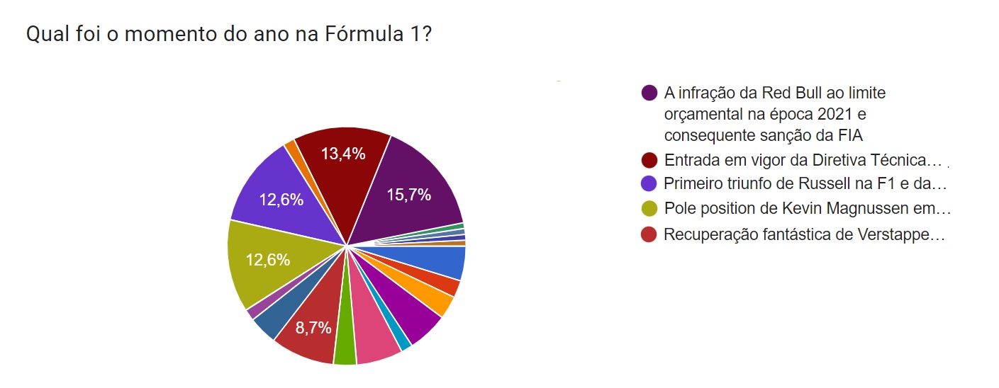 Ao contrário do que aconteceu com a mesma sondagem no final da época passada, a votação para o momento mais marcante de 2022 na Fórmula 1 para os nossos leitores foi mais renhida. Com 15.7% dos votos, a infração da Red Bull ao limite orçamental na época 2021 e consequente sanção da FIA foi a resposta que mais votos recolheu, sendo seguida pela entrada em vigor da Diretiva Técnica da FIA a meio da época (com 13.4% dos votos). Curiosamente dois momentos do ano que ocorreram fora de pista, um com maior incidência nos performances dos monolugares ainda durante a época, enquanto a infração da Red Bull vai custar à equipa de Milton Keynes nos próximos anos. O quanto vai custar o menos tempo de desenvolvimento em túnel de vento e simulações de CFD ainda não sabemos.