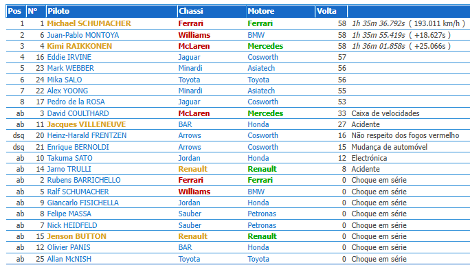 É claro que o quinto lugar lhe caiu do céu, depois do “hara kiri” de oito pilotos na primeira curva, mas Webber resistiu aos ataques de Salo até este cometer um erro, dando o melhor resultado à Minardi desde o GP de França de… 1994!