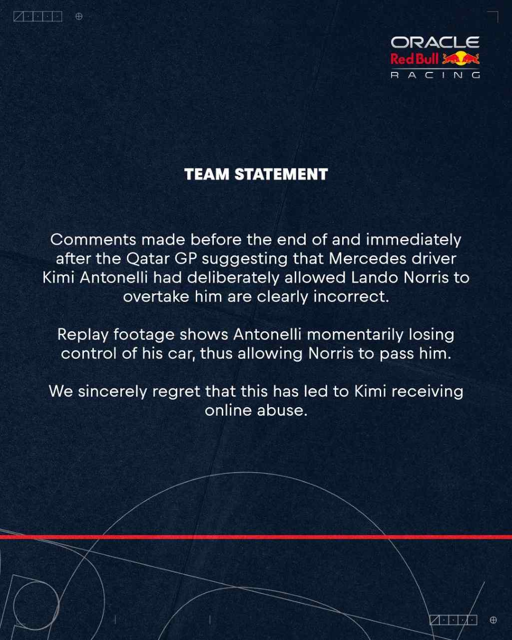 A Red Bull emitiu um comunicado a condenar os ataques e ameaças de morte dirigidos a Kimi Antonelli nas redes sociais, na sequência de um erro do piloto da Mercedes nas voltas finais do Grande Prémio do Qatar, que permitiu a ultrapassagem de Lando Norris para o quarto lugar e dois pontos extra na luta pelo título.