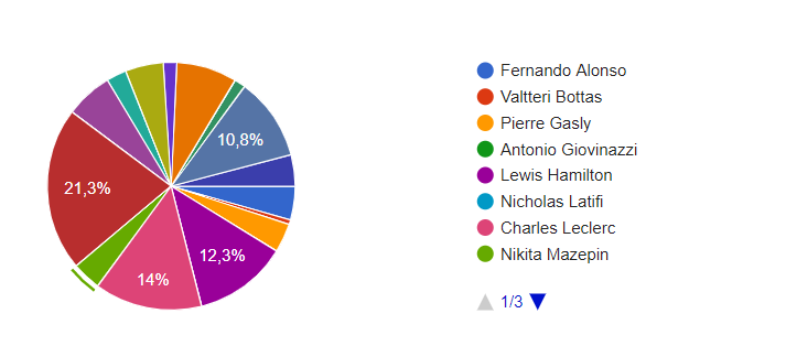 Seguiram-se Max Verstappen (10.8%), Carlos Sainz (7.9) , Sergio Pérez (6.1), Daniel Ricciardo (5%), Fernando Alonso (4.4), Sebastian Vettel (4.1%), Pierre Gasly (3.8), Nikita Mazepin (3.8%), Kimi Raikkonen (2.6%), George Russell (1.8%), Yuki Tsunoda (1.5%) , Valtteri Bottas (0.6%).