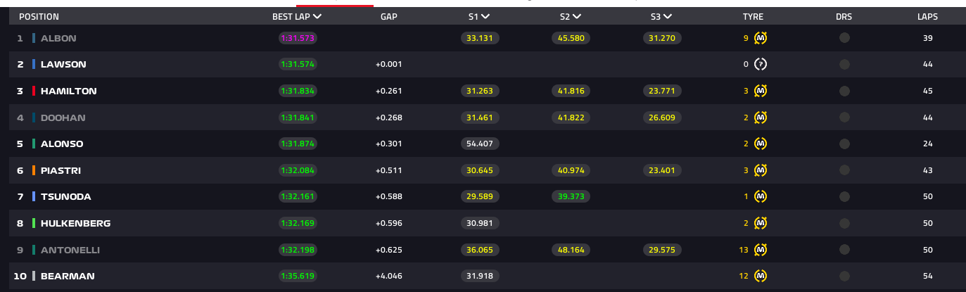 A terceira hora dos testes de F1 iniciou-se como a segunda terminou. Com muitas voltas e com os tempos a caírem gradualmente. Liam Lawson começou a hora como o líder da tabela de tempos, com um tempo feito com pneus duros, mas dez minutos depois de começarmos a terceira hora de testes, Alex Albon tratou de tirar 0.001 seg. ao tempo do piloto da Red Bull, com pneus médios.