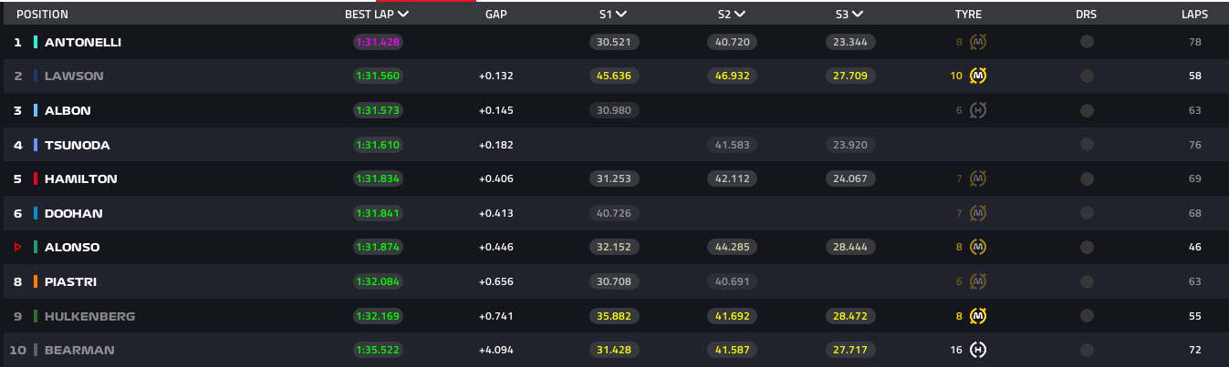 Na segunda hora, Alonso assumiu a liderança, mas foi superado por Liam Lawson, que terminou no topo da tabela. Hamilton teve um pequeno deslize na Curva 11 devido às condições de vento, mas sem grandes consequências.