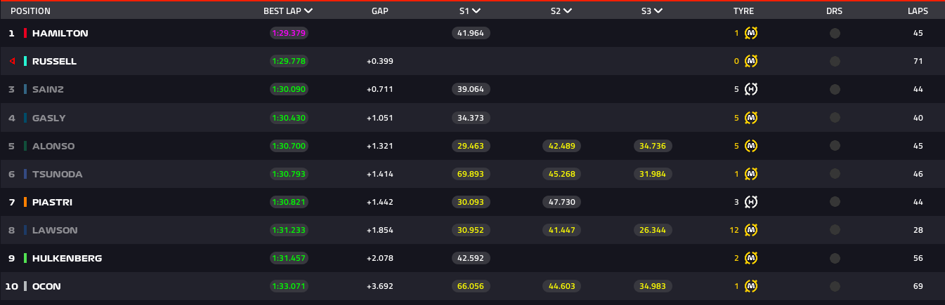 George Russell, também com pneus médios, superou momentaneamente Hamilton, passando pela marca de 1m29.999s, entrando no segundo 29. No entanto, Hamilton recuperou a liderança com uma volta de 1:29.379, mantendo-se no topo da tabela até o final dessa terceira hora.