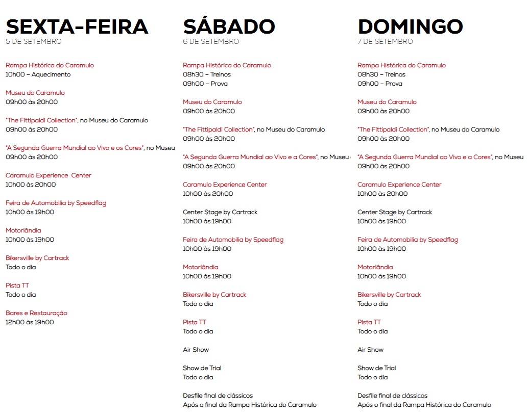 O programa do evento conta com a Rampa Histórica do Caramulo, a Coleção de Automóveis, Motociclos, Velocípedes e Miniaturas do Museu do Caramulo, a Feira de Automobilia, a Bikersville by Cartrack, concentrações de clubes, atividades lúdicas Outdoor, Pista Júnior, parques infantis de entretenimento, bares e zonas chill out com música durante todo o evento, entre outros.