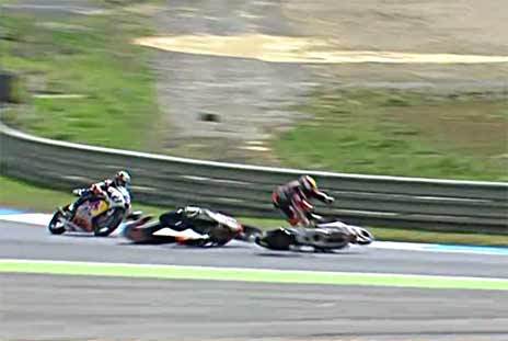 Só que, na travagem para a parabólica anterior, levou por tabela fruto da queda dum adversário, cuja moto o atingiu, enviando o piloto português para um voo que só parou na gravilha da parabólica interior, terminando dessa forma toda e qualquer hipótese de obter um bom resultado. Parecia ter andamento para chegar mais à frente, mas foi infeliz em dois momentos da sua corrida, precisamente o primeiro e o último…
