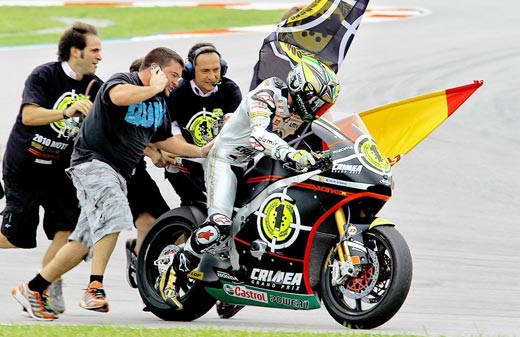 Toni Elias assegurou a conquista do primeiro Mundial de Moto2 depois de terminar o GP da Malásia no quarto posto. A vitória foi para Roberto Rolfo. Toni Elías ficará na história como o primeiro Campeão do Mundo de Moto2, num dia de festa já que Roberto Rolfo conquistou a sua primeira vitória na nova categoria. Alex de Angelis (JiR Moto2) obteve o seu primeiro pódio do ano, foi segundo, tendo mesmo lutado pela vitória com com Rolfo. Andrea Iannone (Fimmco Speed Up) completou o pódio.
