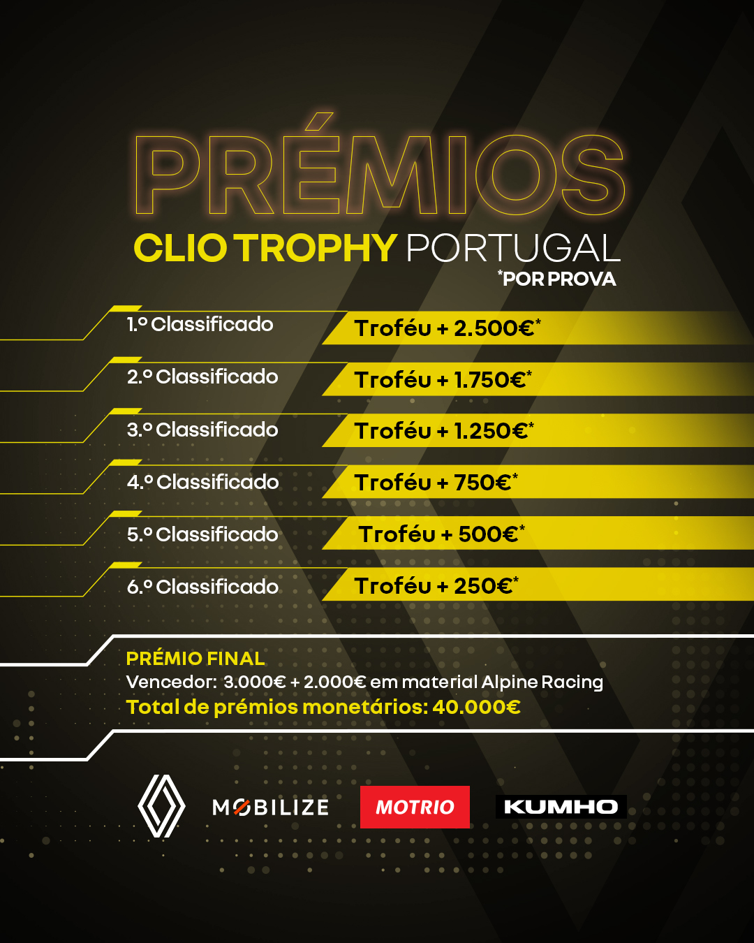 Entretanto, já é conhecido o Regulamento Desportivo do Clio Trophy Portugal, competição que arranca no Rally de Lisboa. Vão ser distribuídos um total de 40.000€ em prémios. Por prova, serão atribuídos 2.500€ ao vencedor, 1.750€ ao segundo classificado, 1.250€ (3º), 750€ (4º), 50€ (5º), 250€ (6º).