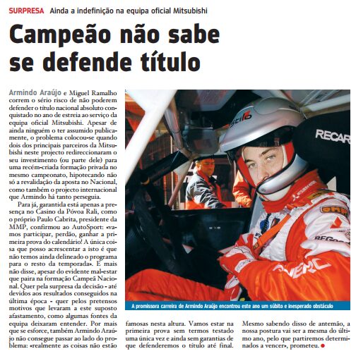 Nesse momento, registamos que a dupla, recém-coroada campeã absoluta com a Mitsubishi oficial, arriscava não defender o ceptro. O problema nascia do redirecionamento do investimento de dois parceiros-chave para uma nova estrutura privada, deixando em causa não só a presença completa no Nacional como o plano internacional que Armindo acalentava há anos. Citavámos Paulo Cabrita, à frente da MMP, a garantir apenas a presença no Casino da Póvoa Rali – e a ambição declarada de o vencer – mas sem um programa fechado para o resto da época, num ambiente de claro desconforto dentro de uma equipa campeã.