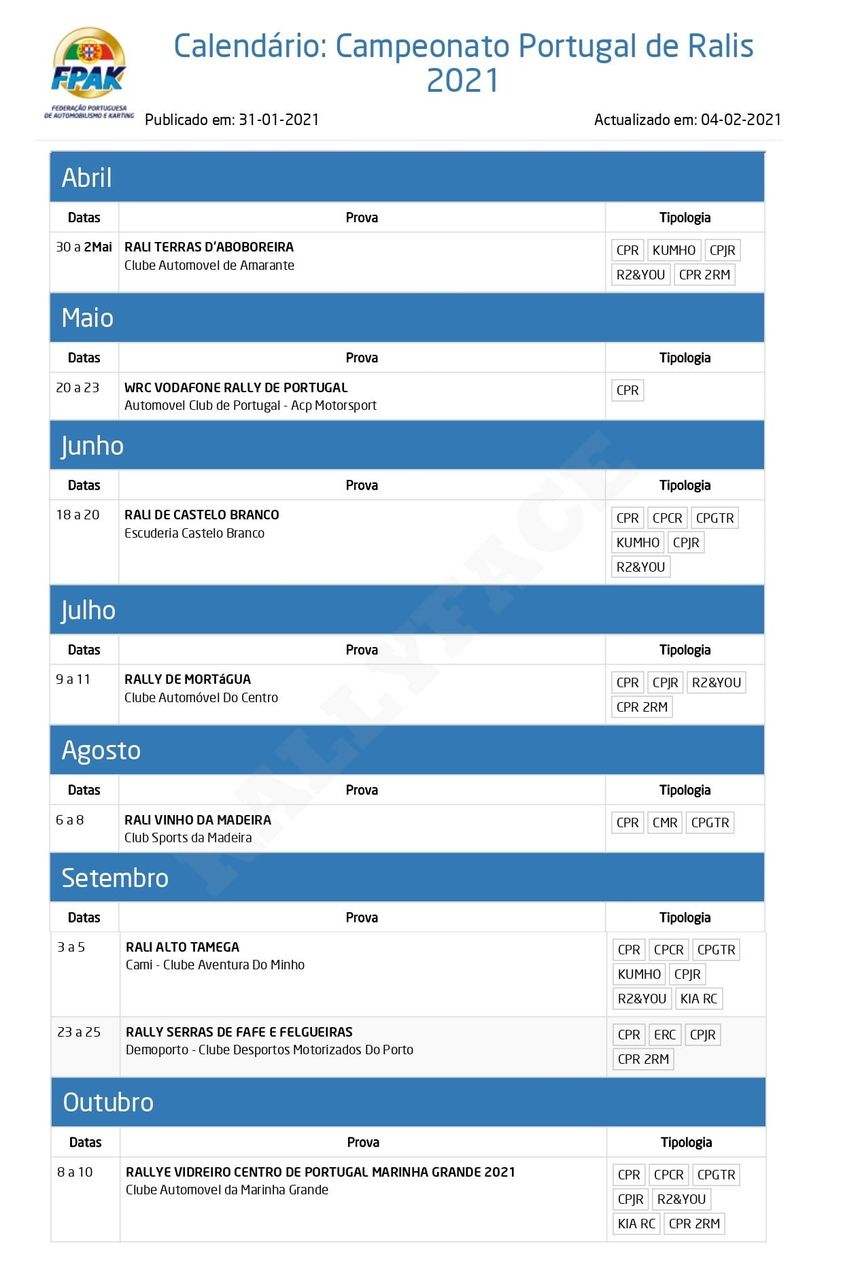 A FPAk divulgou o calendário do Campeonato de Portugal de Ralis, confirmando-se oito provas e a ausência do Azores Rallye e do Rali Casinos do Algarve. Tendo em conta o adiamento já conhecido do Rallye Serras de Fafe e Felgueiras, a competição inicia-se no fim de abril, início de maio com o Rali Terras d’Aboboreira, seguindo-se, três semanas depois o Vodafone Rally de Portugal, na data prevista, 20 a 23 de maio.
