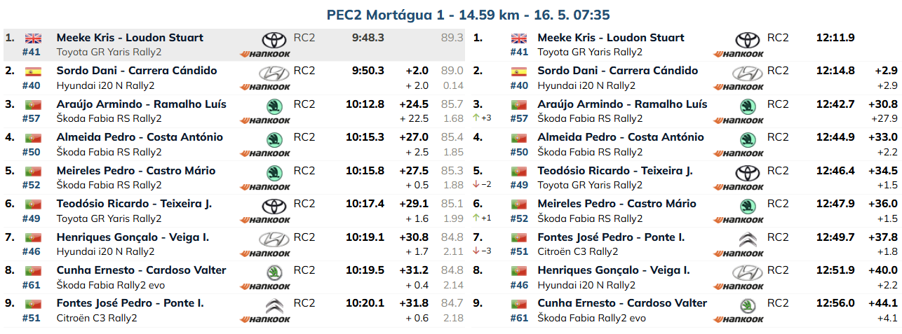Meeke, que fez o nono tempo dos RC2, a 9.9s de Oliver Solberg, tem agora 2.9s de avanço para Sordo, com Armindo Araújo a 30.8s e Pedro Almeida, 2.2s mais atrás. Teodósio caiu para quinto a mais 1.5s e Meireles está outros 1.5s atrás