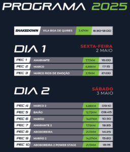 A competição arranca nessa mesma tarde, com a primeira secção a partir de Amarante às 15h30. A primeira especial cronometrada será disputada às 16h00, com o troço de Amarante, que terá uma extensão de 7,72 km. Segue-se a classificativa Marco, com 6,88 km, marcada para as 17h15. A jornada termina com a Super Especial noturna, Marco Rios de Emoção, com 2,07 km, que terá lugar junto ao Tribunal de Marco de Canaveses, a partir das 21h00. A segunda e derradeira etapa do rali realiza-se no sábado, 3 de maio, com arranque previsto para as 08h00. A manhã inclui três especiais: Marco 2, com início às 09h10, Baião, com 12,72 km às 09h45, e Marão, com 14,07 km a disputar-se às 10h30. Após uma paragem para assistência, o rali prossegue com a segunda passagem pelo troço de Amarante, que será percorrido às 13h35. O troço de Aboboreira, o mais longo da prova com 21,13 km, está agendado para as 14h25. A segunda passagem por Marão terá lugar às 15h20, enquanto a última classificativa da prova — Aboboreira 2 — está marcada para as 18h15. Esta última especial servirá como Power Stage, atribuindo pontos adicionais aos mais rápidos.