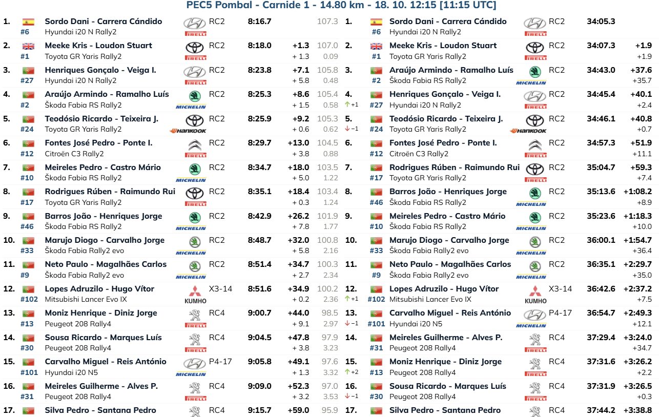 Dani Sordo-Candido Carrera (Hyundai I20 N Rally2) venceram a primeira passagem por Carnide, bateram Kris Meeke-Stuart Loudon (Toyota GR Yaris Rally2) por 1.3s e voltaram a dilatar o seu avanço na frente, colocando-o em 1.9s. O espanhol lidera o rali desde a PEC1, curiosamente a especial em que a margem entre ambos foi maior, 3.7s.
