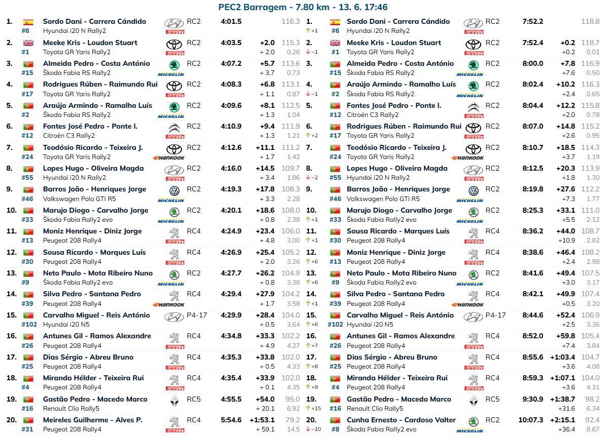 Nas contas da geral, Sordo lidera com 0,2 segundos de vantagem para Meeke, com Pedro Almeida a 7,8 segundos da referência. Armindo Araújo está a 10,2 seg. e José Pedro Fontes está a 12,2 seg.
