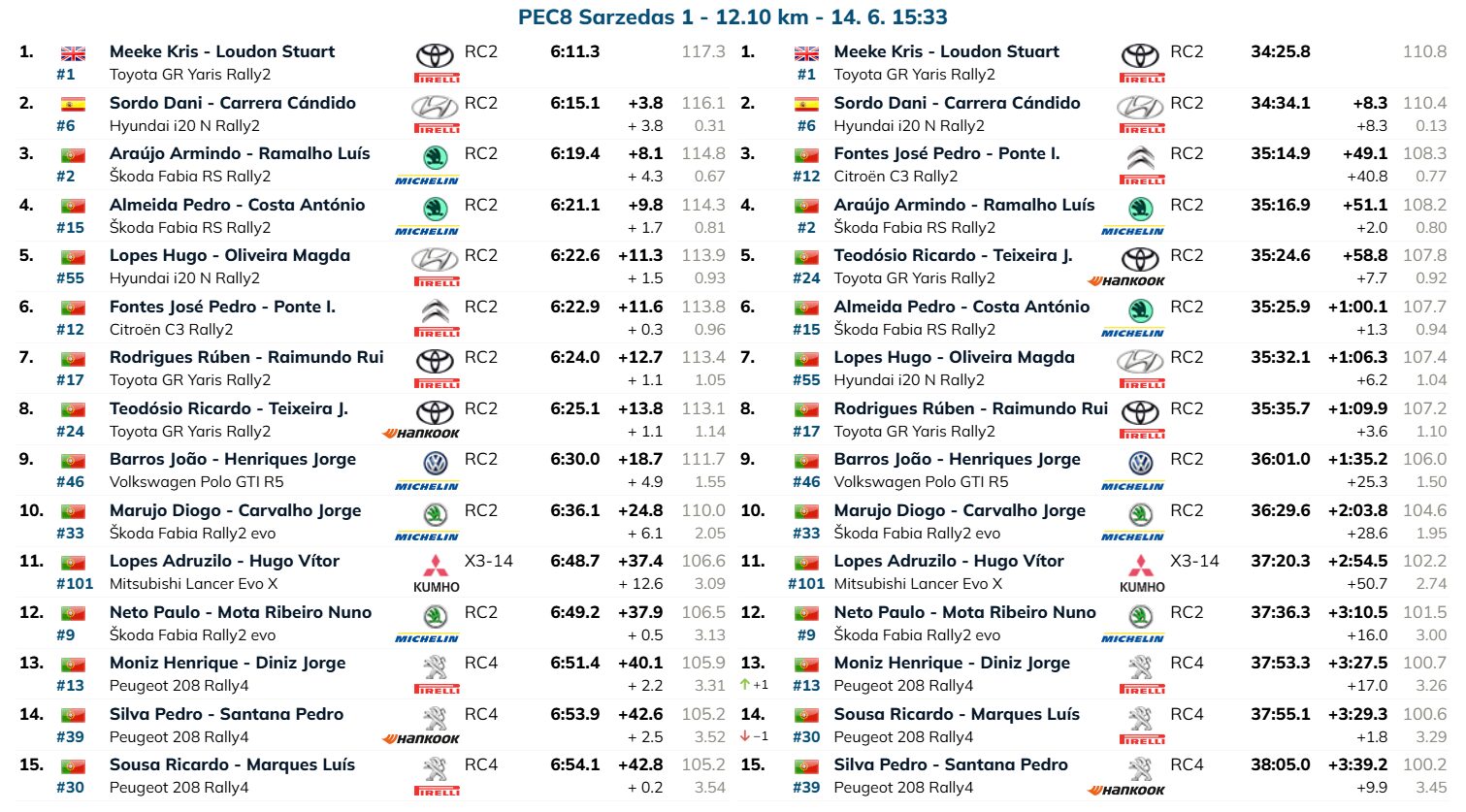 Meeke foi 3,8 segundos mais rápido que Sordo, com Armindo Araújo – Luís Ramalho (Skoda Fabia Rs Rally2) a fazerem o terceiro tempo, ganhando tempo a José Pedro Fontes – Inês Ponte (Citroen C3 Rally2), na luta pelo pódio. Pedro Almeida – António Costa (Skoda Fabia RS Rally2) foram os quartos mais rápidos, à frente de Hugo Lopes – Magda Oliveira (Hyundai I20 N Rally2), dupla que fez o quinto tempo. Rúben Rodrigues – Rui Raimundo (Toyota GR Yaris Rally2) fizeram sétimo tempo, um lugar atrás de Fontes. Seguiram-se Ricardo Teodósio – José Teixeira (Toyota GR Yaris Rally2), João Barros – Jorge Henriques (Volkswagen Polo GTI R5) e Diogo Marujo – Jorge Carvalho (Skoda Fabia Evo Rally2).