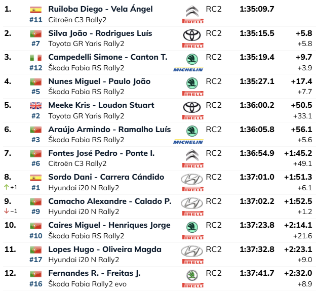 Daniel Sordo – Candido Carrera (Hyundai I20 Rally2), foi sétimo e passou Alexandre Camacho – Pedro Calado (Hyundai I20 Rally2) que é agora nono.
