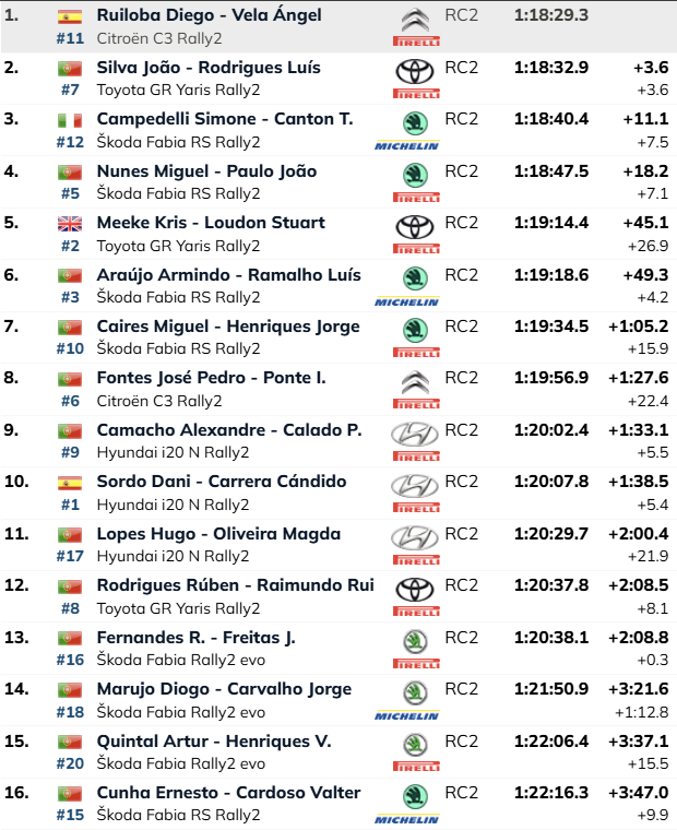 Outras duplas também se destacaram ou tentaram manter as suas posições. Miguel Caires e Jorge Henriques (Skoda Fabia RS Rally2) foram sextos na especial, mantendo o sétimo lugar na geral. José Pedro Fontes e Inês Ponte (Citroën C3 Rally2) ficaram em oitavo, mas a sua desvantagem para Armindo Araújo no CPR já é de 38,3 segundos. Na batalha entre os dois Hyundai, Alexandre Camacho e Pedro Calado (Hyundai i20 Rally2) mantêm uma vantagem de 5,4 segundos sobre Daniel Sordo e Cándido Carrera (Hyundai i20 Rally2), que fecham o top 10. Hugo Lopes – Magda Oliveira (Hyundai I20 Rally2) rodam 21.9s mais atrás.