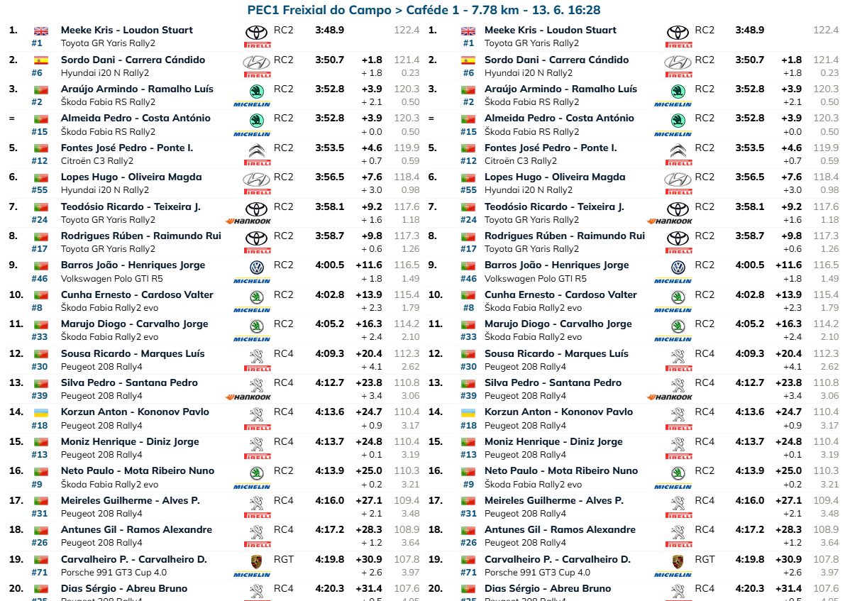 Daniel Sordo – Cándido Carrera (Hyundai I20 N Rally2) ficaram em segundo a 1,8 segundos da referência. Armindo Araújo – Luís Ramalho (Skoda Fabia Rs Rally2) e os vencedores do Rally de Portugal, Pedro Almeida – António Costa (Skoda Fabia RS Rally2) fizeram o terceiro melhor tempo.