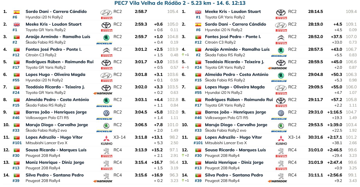 Nas contas da geral, Meeke termina esta manhã com na liderança, com 4,5 segundos de vantagem para Sordo, com José Pedro Fontes a completar o pódio provisório. Armindo Araújo é quarto, a 5,5 do terceiro lugar, tendo ultrapassado Ricardo Teodósio, que agora é quinto, a dois segundos de Araújo. Pedro Almeida está a 5,3 segundos do top 5, à frente de Hugo Lopes, Rúben Rodrigues, João Barros e Diogo Marujo.