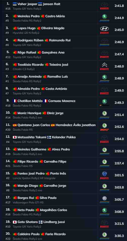 Rúben Rodrigues-Rui Raimundo (Toyota Gr Yaris Rally2) foram quartos a 5.1s, na frente de Rafael Rêgo-Ana Gonçalves (Toyota Gr Yaris Rally2) a 5.6s. Sexto posto para Ricardo Teodósio-José Teixeira (Citroën C3 Rally2) a +6.2. Seguiram-se Armindo Araújo-Luís Ramalho (Škoda Fabia Rs Rally2) a 7.1s, e a fechar o top 10, Pedro Almeida-António Costa (Toyota Gr Yaris Rally2) a 7.2s, Mattéo Chatillon-Maxence Cornuau (Škoda Fabia Rs Rally2) a 7.5s e Henrique Moniz-Jorge Diniz (Škoda Fabia Evo Rally2) a 9.6s.