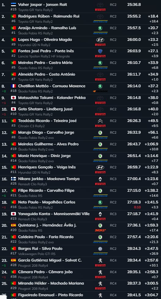 Armindo Araújo e Luís Ramalho (Škoda Fabia RS Rally2) ocupam a terceira posição, a 2.3s de Rodrigues. Após uma qualificação estratégica, têm gerido a prova sem erros e mantêm margem para atacar.