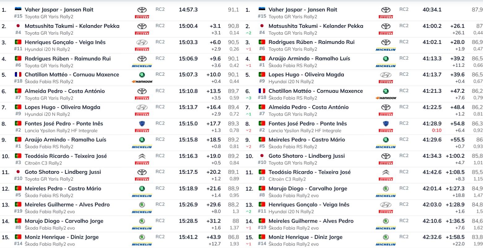 Mattéo Chatillon / Maxence Cornuau (Škoda Fabia RS Rally2) foram os quintos mais rápidos, seguidos de Pedro Almeida / António Costa (Toyota GR Yaris Rally2), Hugo Lopes / Magda Oliveira (Hyundai i20 N Rally2) e José Pedro Fontes / Inês Ponte (Lancia Ypsilon Rally2 HF Integrale), penalizados com dez segundos à saída do parque de assistência. Armindo Araújo / Luís Ramalho (Škoda Fabia RS Rally2) fez o nono tempo e Ricardo Teodósio / José Teixeira (Citroën C3 Rally2) completou o top 10. Armindo Araújo perdeu 18,5 segundos para o melhor tempo e viu Rodrigues “fugir” na liderança.