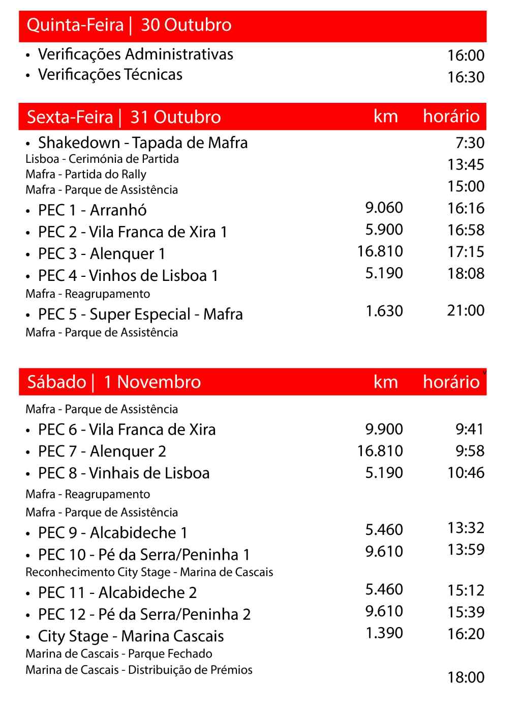 A ação tem início na manhã de sexta-feira (dia 31) com o Shakedown das 07h30 às 10h30 em Sobral da Abelheira, num percurso de 3,13 quilómetros, sessão que permitirá às equipas fazer as derradeiras afinações antes do arranque oficial do rali. Segue-se a Cerimónia de Partida, no Padrão dos Descobrimentos, em Belém (Lisboa), às 13h45, marcando o arranque simbólico do rali.