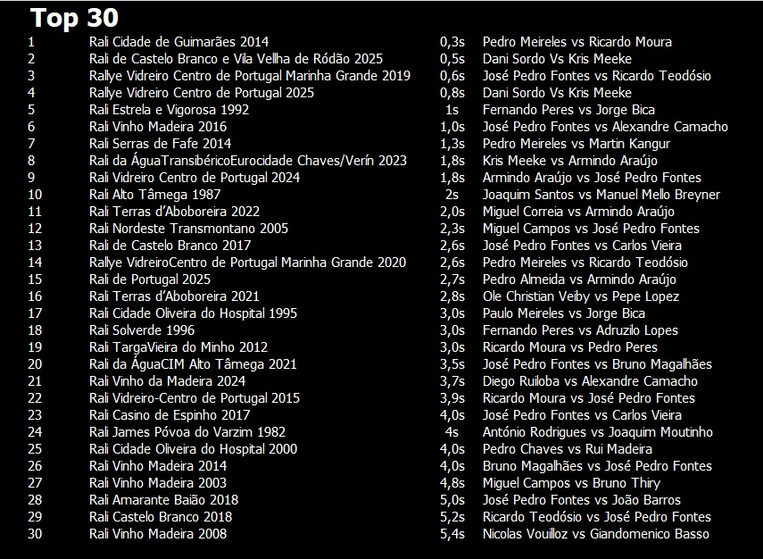 A prova mais antiga no top 5 continua a ser o Rali Estrela e Vigorosa de 1992, com Fernando Peres a bater Jorge Bica por exatamente um segundo – um desfecho eletrizante que, 32 anos depois, ainda ressoa na história dos ralis nacionais.