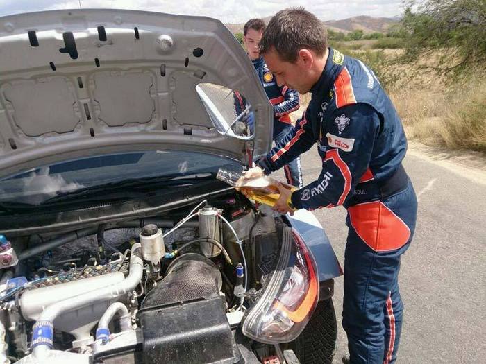 A Hyundai está em risco de não confirmar o seu primeiro pódio no WRC, já que o i20 WRc está parado na ligação para o parque de assistência final do Rali do México, com Nicolas Gilsoul a tentar arrefecer os ‘ânimos’ do motor, dando o melhor que há na zona para matar a ‘sede’, uma Corona. Foto de Colin Clark, da World Rally Radio ?@voiceofrally