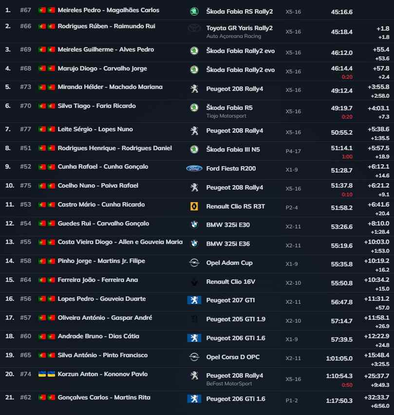 O terceiro lugar foi para Guilherme Meireles e Pedro Alves (Skoda Fabia Evo Rally2), que se estrearão no CPR com o seu novo Rally2. Diogo Martins (Marujo) e Jorge Carvalho (Skoda Fabia R5 Evo) ficaram em quarto lugar, com as duas duplas separadas por apenas 2.4s na luta pelo terceiro lugar.