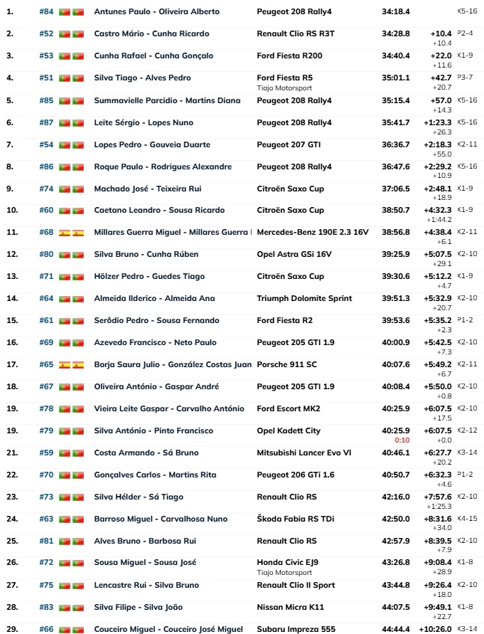 A prova foi ganha por Paulo Antunes-Alberto Oliveira (Peugeot 208 Rally4) que bateram Mário Castro-Ricardo Cunha (Renault Clio RS R3T) por 10.4s com Rafael Cunha-Gonçalo Cunha (Ford Fiesta R200) em terceiro a 22.0s. Seguindo-se os novos Campeões Norte de Ralis, Tiago Silva-Pedro Alves (Ford Fiesta R5).
