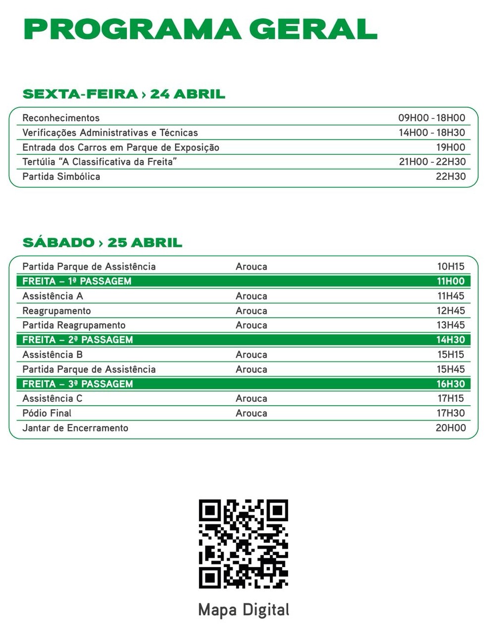 O programa distribui-se por dois dias que combinam evocação, proximidade e espetáculo. Na sexta-feira, 24 de abril, o ambiente começa a ganhar forma com os reconhecimentos ao longo do dia e as verificações administrativas e técnicas (no Parque de Assistência de Ribes, em Arouca) durante a tarde, culminando, a partir das 19h00, com a exposição das viaturas no centro de Arouca (Av. 25 de abril), naquele que é o primeiro grande momento de contacto direto e privilegiado entre público, máquinas e pilotos.