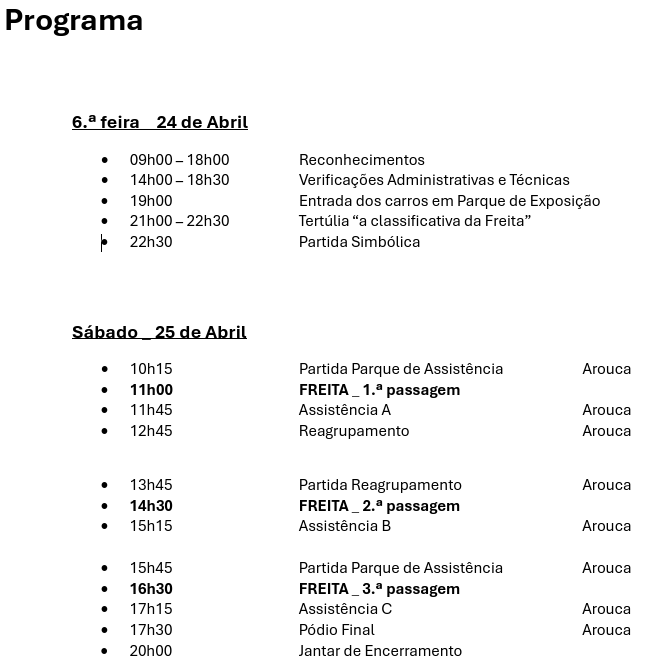 O evento arranca a 24 de abril com exposição das viaturas no centro histórico de Arouca e uma tertúlia dedicada à história da classificativa, antes da partida simbólica durante a noite. No dia 25, o programa atinge o ponto alto com três passagens pela Freita, numa versão de cerca de 20 quilómetros, com passagens pelo parque de assistência e encerramento previsto para o final da tarde, num formato de exibição sem pressão classificativa.
