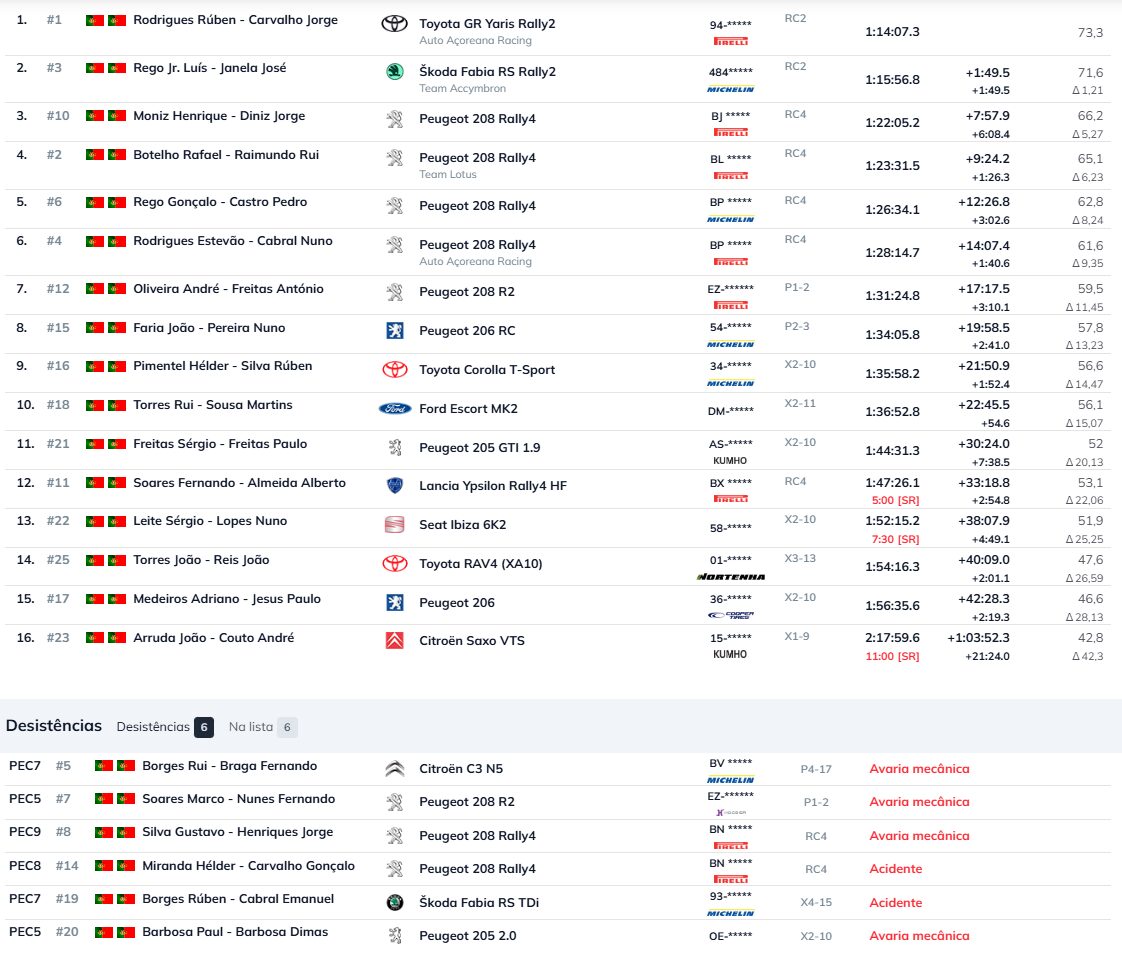 Rúben Rodrigues, agora a competir no campeonato principal português, inscreve assim o seu nome no livro de ouro da prova. O ritmo que o piloto açoriano adquiriu no CPR permitiu-lhe não conceder quaisquer veleidades aos seus adversários neste rali, nomeadamente a Luís Rego, mesmo correndo este com regularidade nestas estradas, tendo também queixado-se de problemas mecânicos persistentes no seu Skoda.