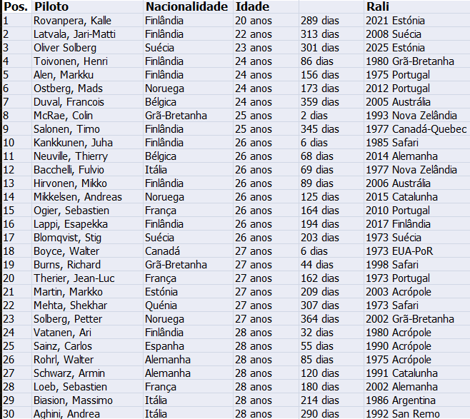 O Campeonato do Mundo de Ralis tem sido, ao longo das décadas, palco de feitos heroicos, mas há algo de especial quando um jovem, ainda com acne ou à procura da sua primeira casa, se impõe frente a pilotos com muito maior experiência. Esta tabela dos 30 mais jovens vencedores de sempre em provas do WRC é uma cápsula do tempo onde talento precoce, coragem pura e histórias improváveis se cruzam em cada linha.