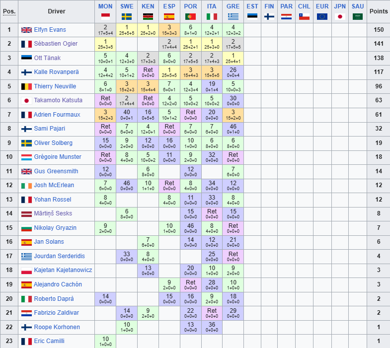 À medida que se chegou ao meio do campeonato, Evans acumulou uma média de pontos de 21,4 por ronda – o que é superior aos dois campeões anteriores, Thierry Neuville e Kalle Rovanperä, neste ponto da temporada em 2024 e 2023, respetivamente. Curiosamente, Neuville venceu o título no ano passado – uma temporada de 13 rondas – com uma média de pontos de 18,6, enquanto Rovanperä triunfou em 2023 com uma média de 19,2 pontos por ronda.