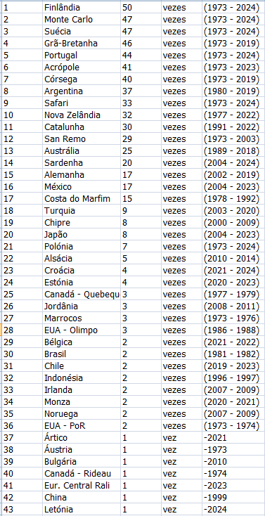 Já nos últimos seis anos (2019-2024) foram estreados oito novos ralis no WRC (é verdade que a pandemia levou a isso) , mas também é verdade que depois da estreia de três novos ralis em 2021, Bélgica, Croácia e Ártico, só em 2025 serão estreados mais três novos ralis: Rali das Canárias, Rali do Paraguai e Rali da Arábia Saudita.