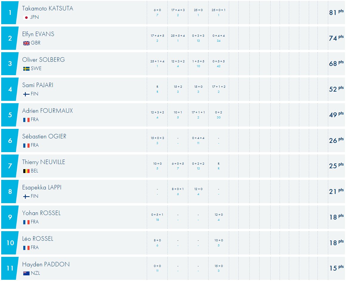 Com a ‘promoção’ de Takamoto Katsuta, o japonês é o novo líder do Campeonato, mas caso Neuville se tivesse mantido na estrada e vencido a prova seria Elfyn Evans a liderar. Com estes resultados acentuou-se o domínio da Toyota, que ocupa agora os quatro primeiros lugares do Mundial. Atrás de Katsuta e Evans, surge o jovem Oliver Solberg em terceiro, seguido de Sami Pajari.