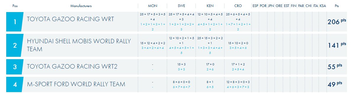 Para a Hyundai, Adrien Fourmaux é agora o melhor representante da marca sul-coreana, ocupando o quinto posto, enquanto Thierry Neuville caiu para a sétima posição. No campeonato de construtores, a formação de Alzenau viu a distância para a Toyota aumentar para 65 pontos, perdendo a oportunidade de recuperar terreno em solo europeu.