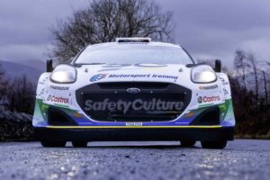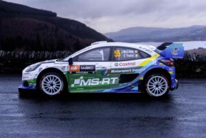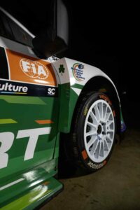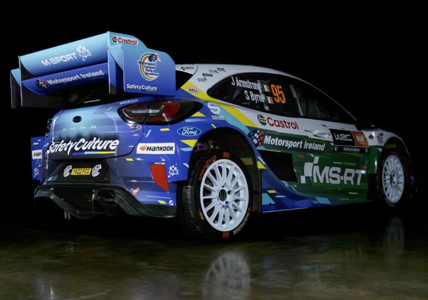 Os logótipos da Motorsport Ireland Rally Academy, programa que apoia os pilotos de fábrica Josh McErlean e Jon Armstrong para a temporada de 2026 aparecem nas laterais e na base do capô. O verde e azul predominantes na frente do carro evocam a pintura tradicional da academia irlandesa, utilizada anteriormente por McErlean antes da sua integração na formação Rally1 da M-Sport em 2025. O logótipo da Castrol complementa a composição.