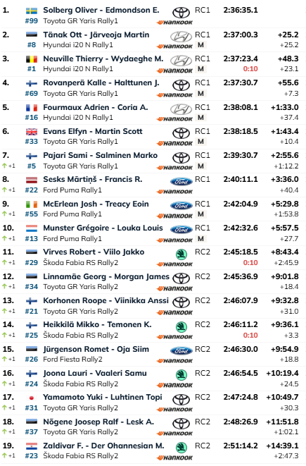Oliver Solberg foi o piloto que mais pontuou nesta prova, 33 pontos, mas os 24 de Ott Tanak, com o segundo lugar na prova, terceiro lugar no super domingo e segundo na PowerStage, foram suficientes para passar Elfyn Evans no campeonato, pois o galês somente somou 11 pontos, pois nem no super domingo (2 pontos) ou na PowerStage, um ponto esteve bem pelo que Ott Tanak é agora o novo líder do Mundial de Ralis – Pilotos com 162 pontos, mais um do que Elfyn Evans, com o estónio a passar os dois homens da Toyota à sua frente, Evans e Séb Ogier.