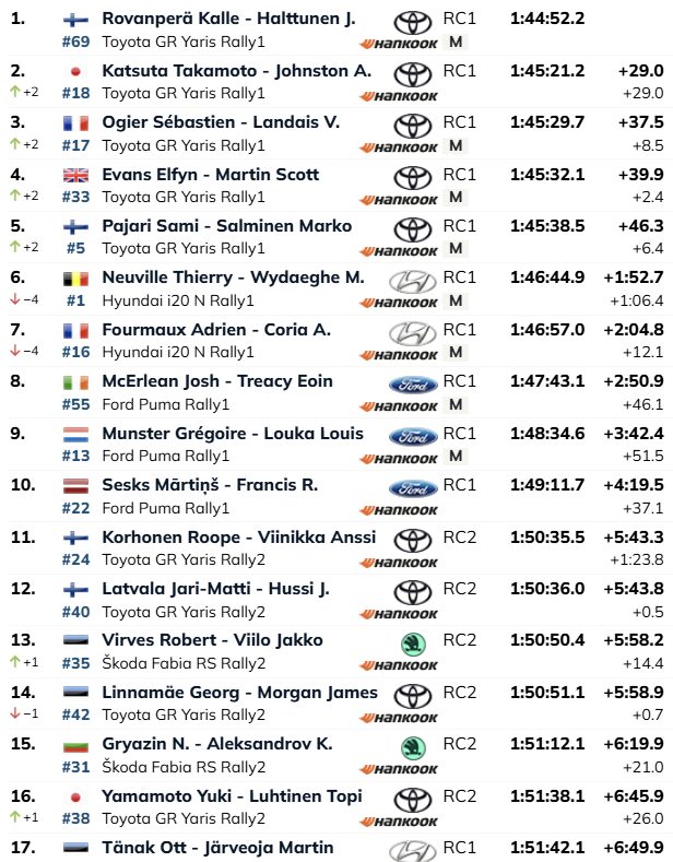 Kalle Rovanperä e Jonne Halttunen, ao volante do Toyota GR Yaris Rally1, consolidaram a sua liderança, ostentando agora uma vantagem de 29,0 segundos sobre Takamoto Katsuta e Aaron Johnston, também em Toyota GR Yaris Rally1. Sébastien Ogier e Vincent Landais, noutro Toyota GR Yaris Rally1, ascenderam ao terceiro lugar, a 37,5 segundos da frente. Elfyn Evans e Scott Martin (Toyota GR Yaris Rally1) ocupam a quarta posição, a 6,4 segundos de Ogier, seguidos por Sami Pajari e Marko Salminen (Toyota GR Yaris Rally1), que completam o domínio da marca japonesa nas posições cimeiras.