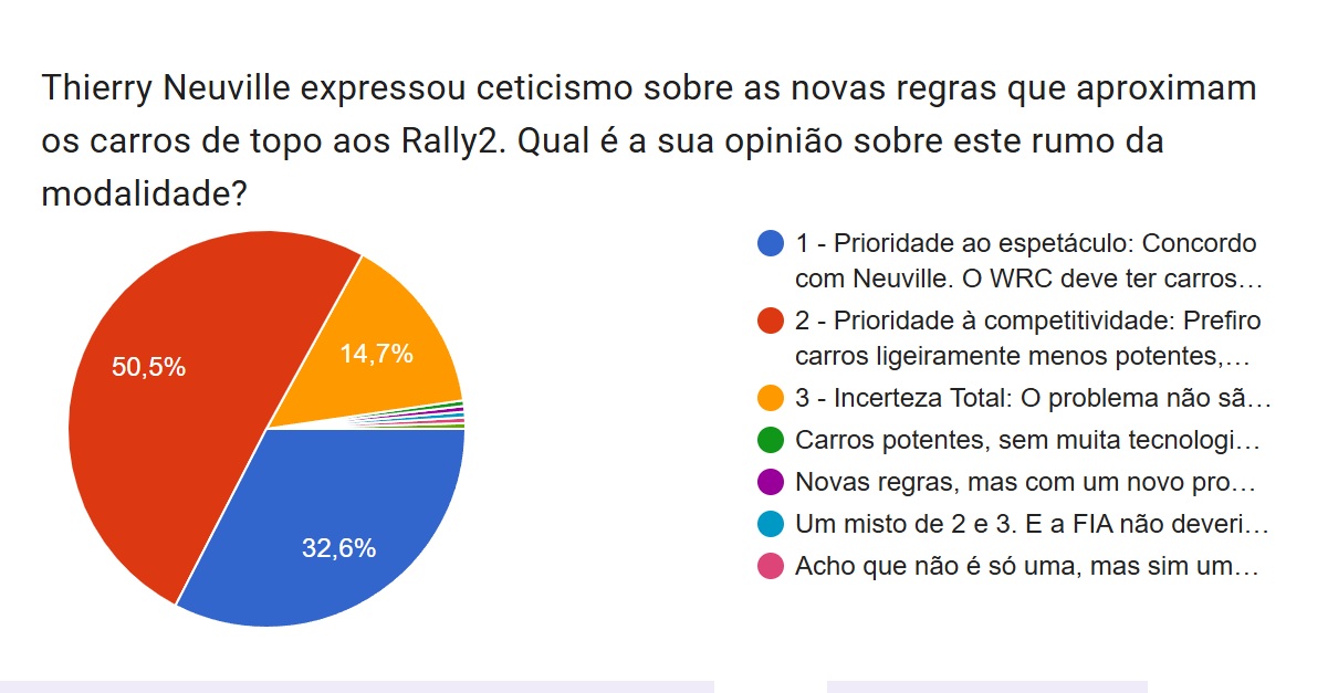 Contudo, é muito grande a fatia de adeptos que prefere dar “ Prioridade ao espetáculo: Concordo com Neuville. O WRC deve ter carros tecnologicamente avançados e potentes que façam sonhar; reduzir a performance afasta o interesse de fãs e pilotos.” 32.6% dos leitores votaram no espetáculo, e isto são números que não podem ser desprezados. Até porque, 14.7% estão numa “ Incerteza Total: O problema não são as regras, mas a falta de um Promotor forte. Sem isso, nenhuma mudança salvará o campeonato.” Houve também uma fatia de 2.2% com opiniões diversas, por exemplo “Acho que não é só uma, mas um pouco das três…”