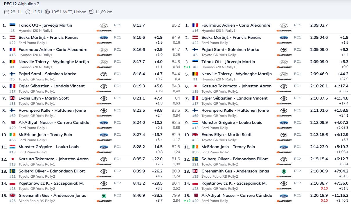 Na luta pelo Mundial, Sébastien Ogier (Toyota GR Yaris Rally1) ganhou 1,8 segundos a Elfyn Evans (Toyota GR Yaris Rally1) apesar de um furo lento: “Tivemos um pneu furado, mas o tempo foi bom!”. Evans geriu as condições: “Bastante difícil, especialmente nos cruzamentos. Mantive a calma”.