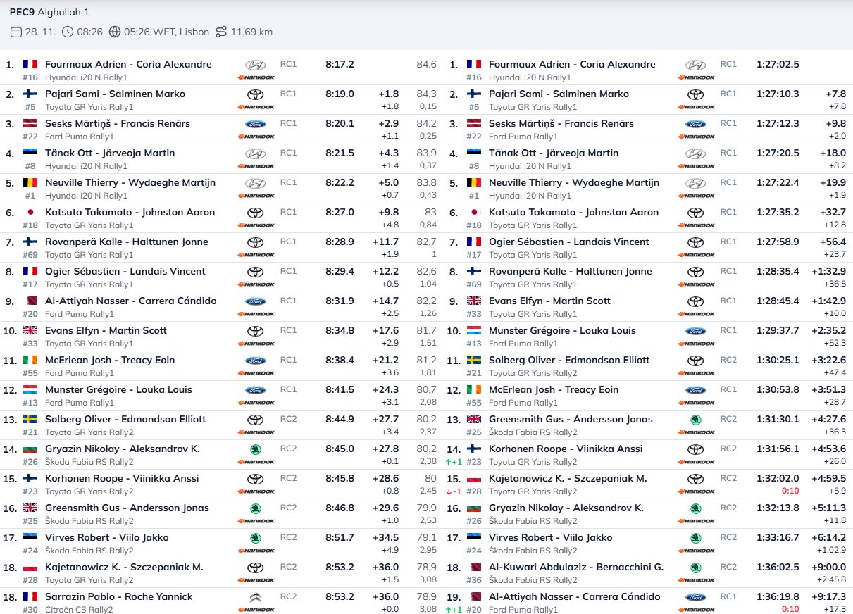 Apesar de beneficiarem de uma melhor posição na estrada em comparação ao primeiro dia, Ott Tänak e Thierry Neuville continuam a perder terreno para o grupo da frente, já a cerca de vinte segundos do líder. As condições mantêm-se exigentes, com uma superfície predominantemente arenosa que exige constante adaptação.