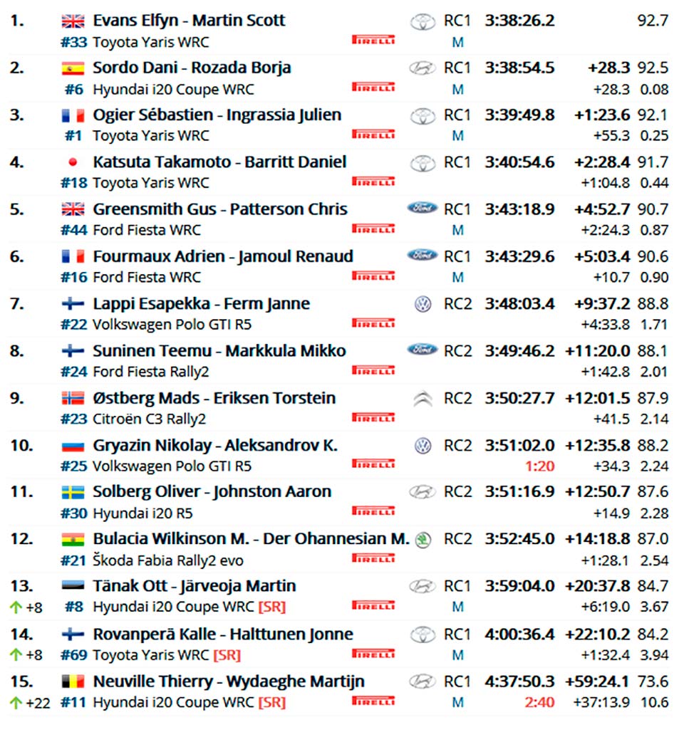 Thierry Neuville/Martijn Wydaeghe (Hyundai I20 Coupé WRC) por 0.3s, com Elfyn Evans/Scott Martin (Toyota Yaris WRC) a 1.4s. Os líderes da prova, Dani Sordo/Borja Rozada (Hyundai I20 Coupé WRC) perderam 2.7s e na geral os espanhóis têm agora 8.2s de avanço para Neuville, com Tanak 1.1s mais atrás. Três Hyundai separados por 9.3s.