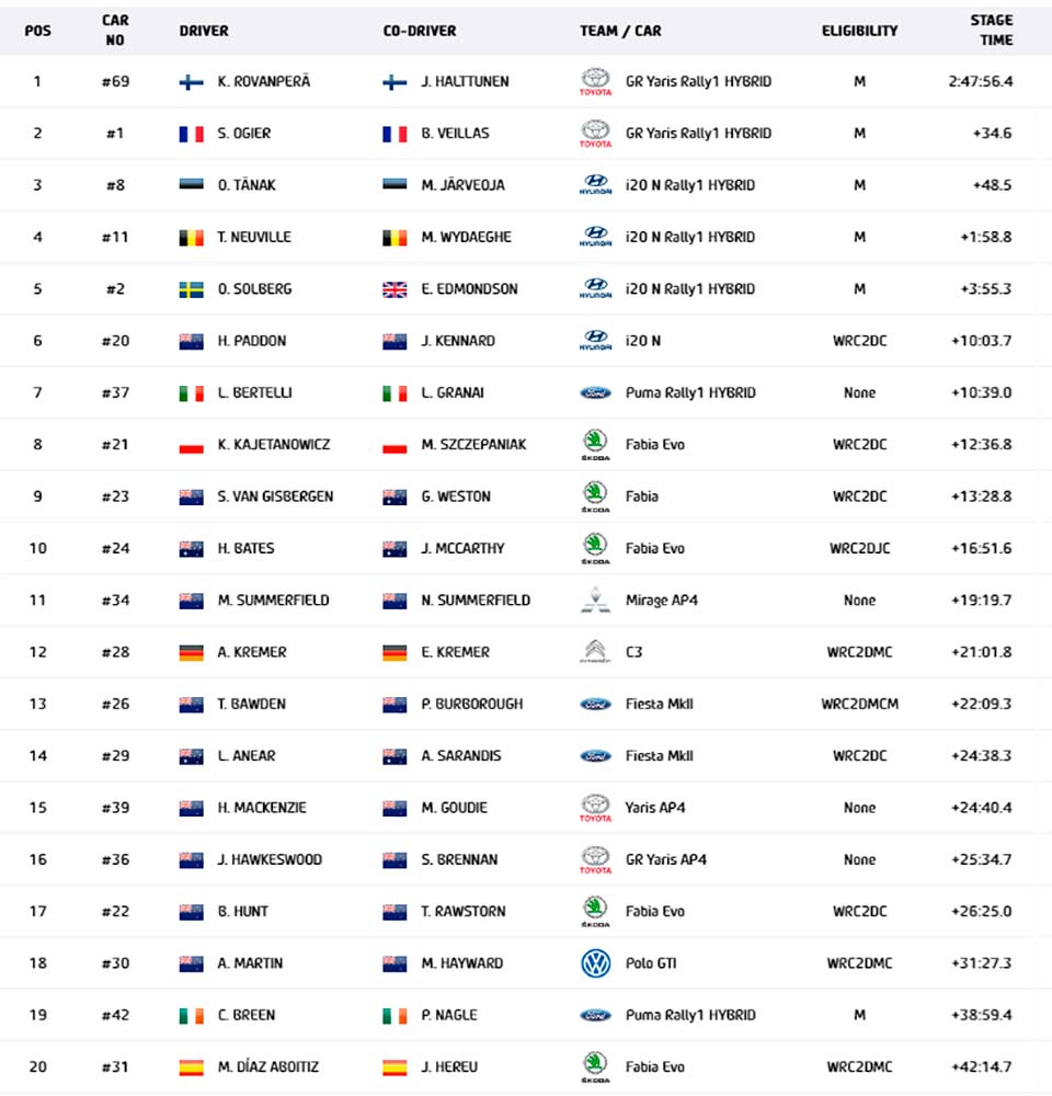 Kajetan Kajetanowicz/Maciej Szczepaniak (Škoda Fabia Rally2 evo) foram oitavos na frente de Shane van Gisbergen/Glen Weston (Škoda Fabia Rally2 evo) com Harry Bates/John McCarthy (Škoda Fabia Rally2 evo) a fechar o top 10, mas desses falaremos noutro lado.